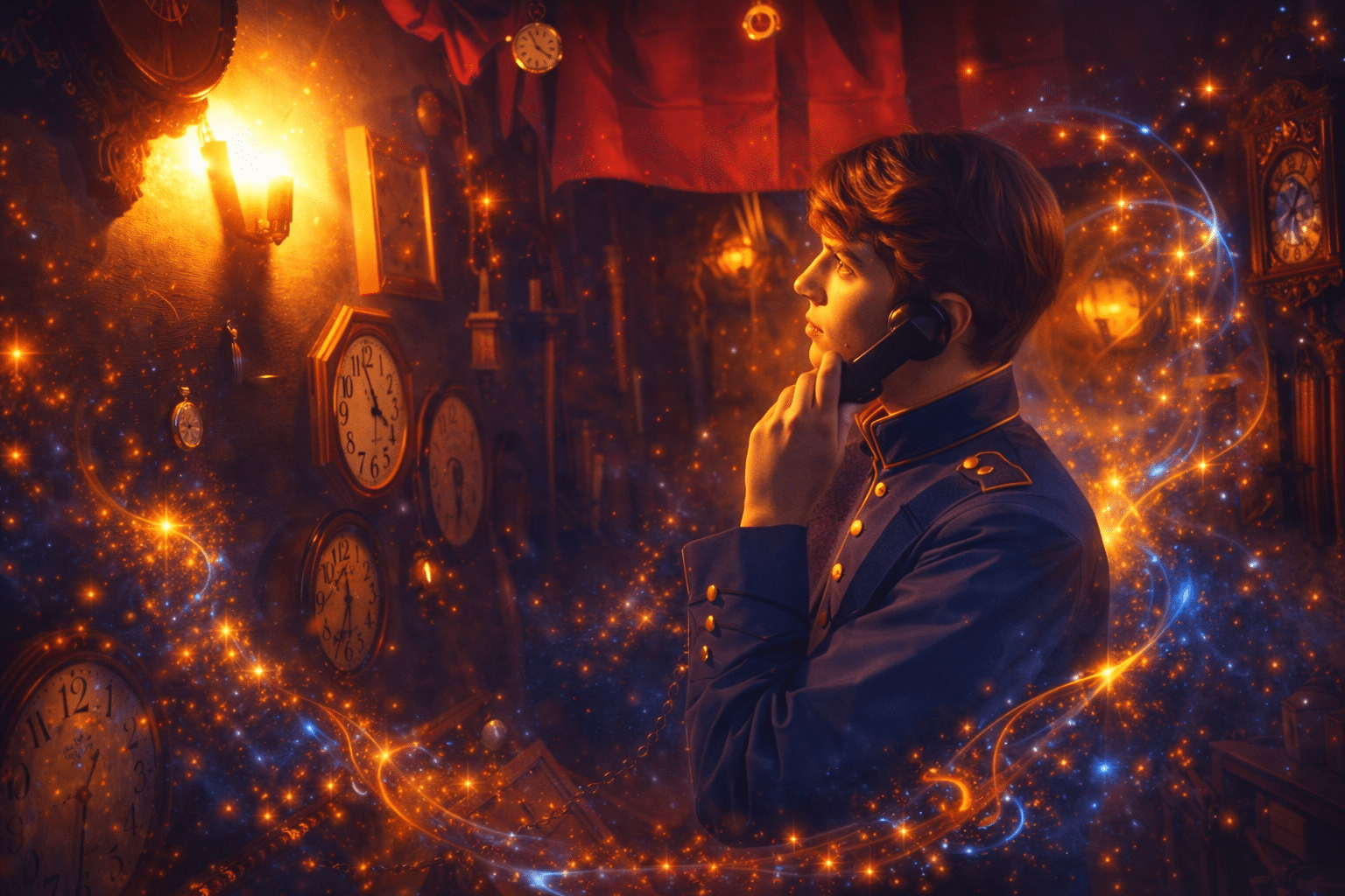 TICK! „Warum wird die Uhr zur Proklamation des Rhythmus? Halt – Zeit, Uhrwerk. Ein Klang erinnert mich. Erinnerungen an Zeit und Uhr, gewoben in den Schleier der Geheimnisse. Doch ein Bann, ein Fluch! Was bedeutete er noch? Gut, eins ist gewiss: Hier, wo immer wir verharren, ist es nicht das gewohnte Szenario – das hoffe ich inständig. Und die Dunkelheit, sie umarmt uns fest. Ein Licht muss entfachen, eine Fackel des Sehens, die die Erinnerung wieder entzündet.“