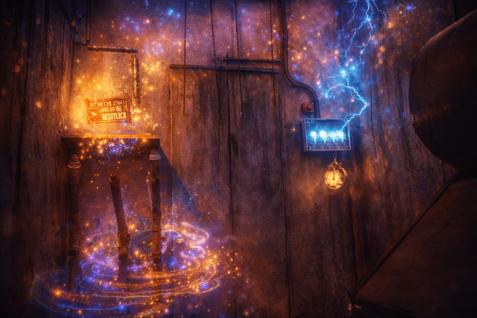 TOCK!… „Was ist das? Ein Hauch von Klang erreicht meine Ohren. Metallisch, wie das Flüstern vergessener Maschinen. Ja, ja, ich spüre es. Mechanik erwacht, vielleicht öffnet sich das Tor? Oh, erhelle uns, schenke uns den Weg, damit wir nicht in der Finsternis verharren, so wie einst … wie der Schatten! Der Schatten! Der Fluch!“